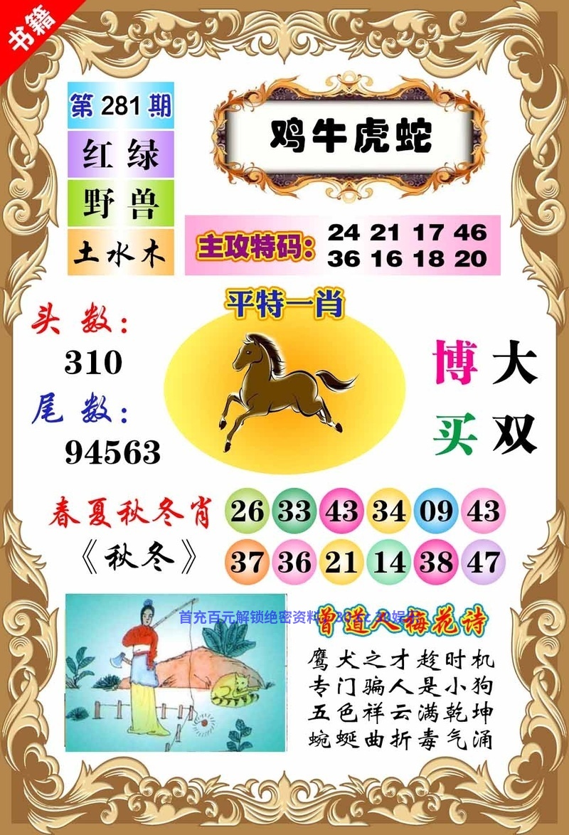 281期曾道人梅花诗:鹰犬之才趁时机,专门骗人是小狗,五色祥云满乾坤,蜿蜒曲折毒气涌 解释:鹰犬之才趁时机,专门骗人是小狗,五色祥云满乾坤,蜿蜒曲折毒气涌解虎牛肖 综合解肖:虎牛鼠狗马羊猴鸡龙 | ||||||||||||||||||||||||||||||||||||||||||||||||||